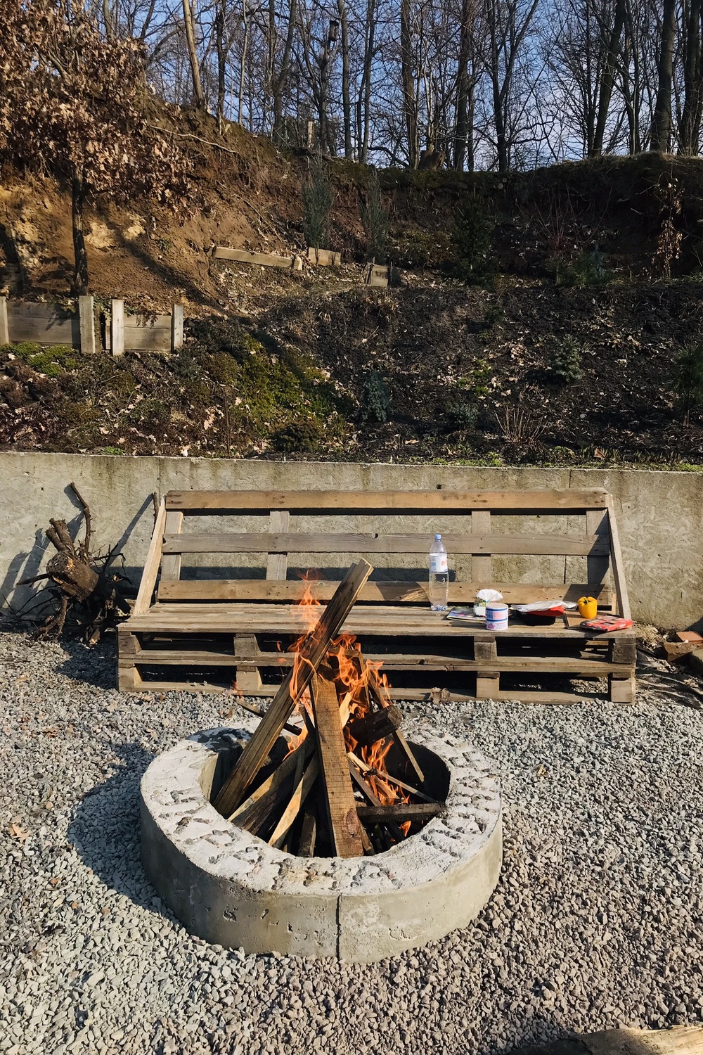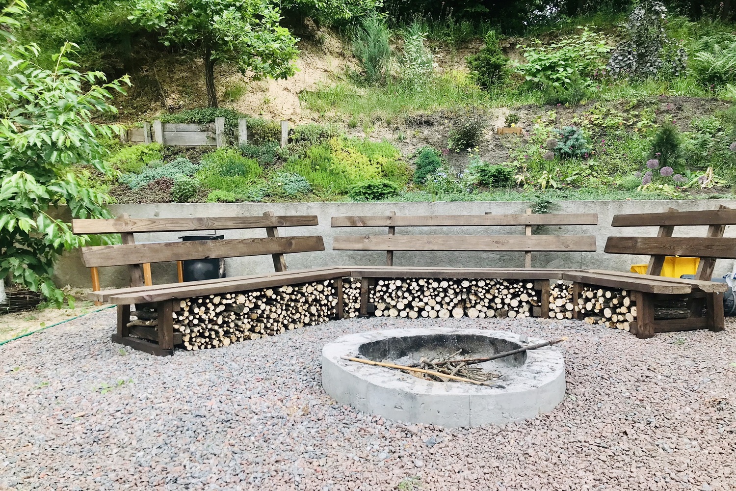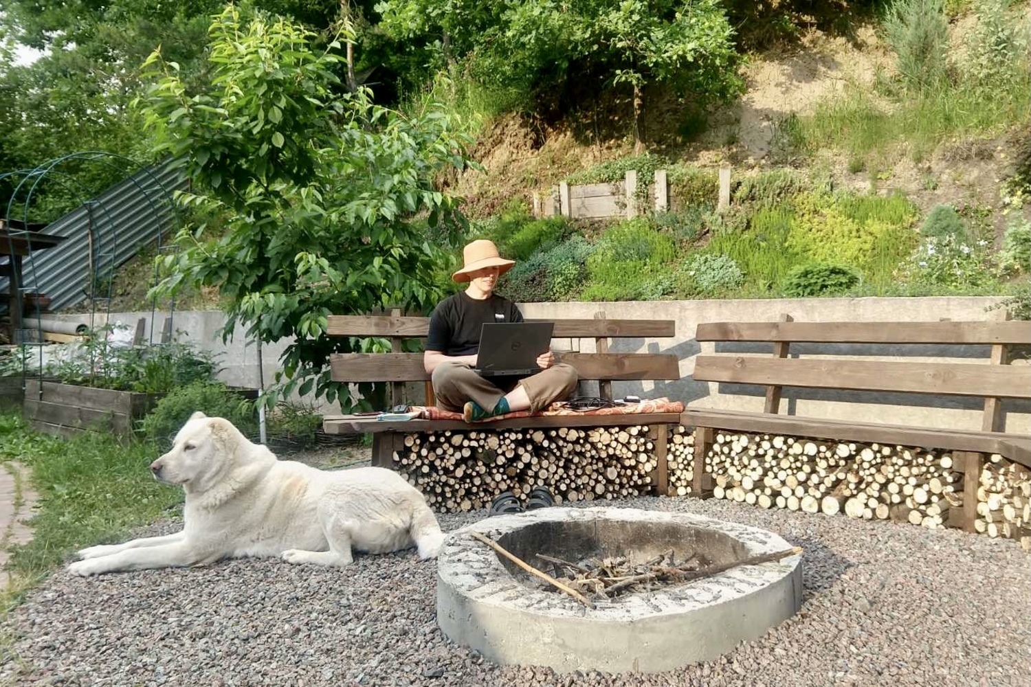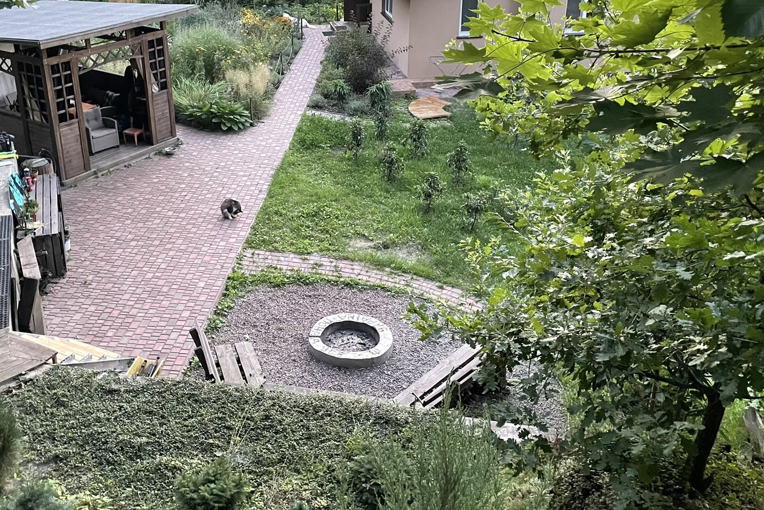 Наша зона багаття — про натуральні матеріали і живу роботу руками. Праворуч від неї — сходи, що ведуть у ліс. Тут переважає дерево, прості форми й чесні рішення. Вогнетривке покриття — засипка щебнем, кругла основа з бетону, в середині якої розташоване місце для кострища, я заливала з бетону власноруч. Було весело, важко, дуже по-справжньому — той момент, коли тіло втомлюється, а душа радіє. Спочатку стояла тимчасова лавка з палет, а згодом чоловік зробив зручні дерев’яні лавки зі спинкою — і простір одразу став іншим.